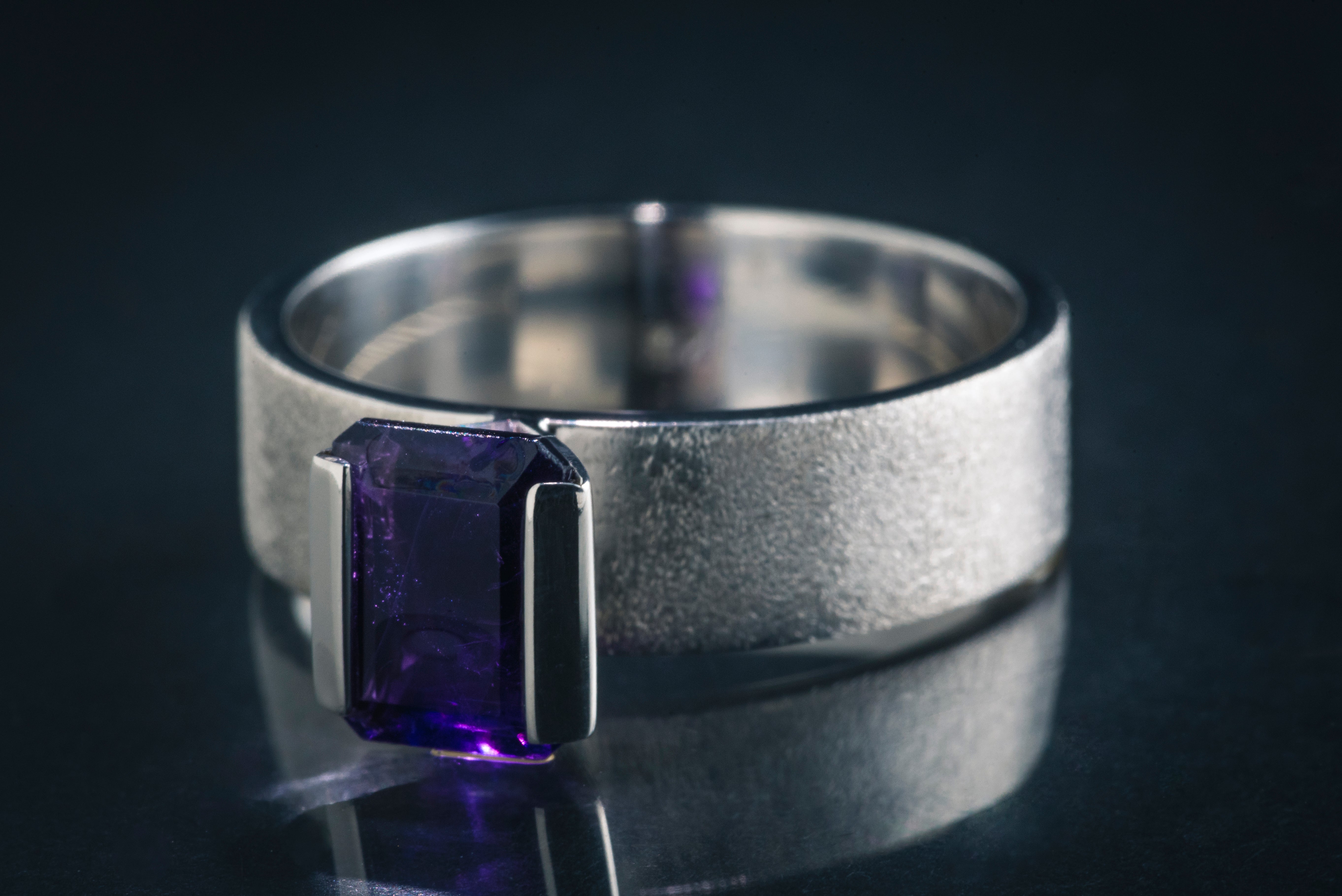 A unique handmade silver ring, crafted in 925 sterling silver and set with a natural amethyst in a deep violet hue. The geometric setting and matte or glossy finish give it a modern and minimalist look. Perfect for those who value original handmade jewellery – ideal as a gift or as a stylish everyday and occasion piece.